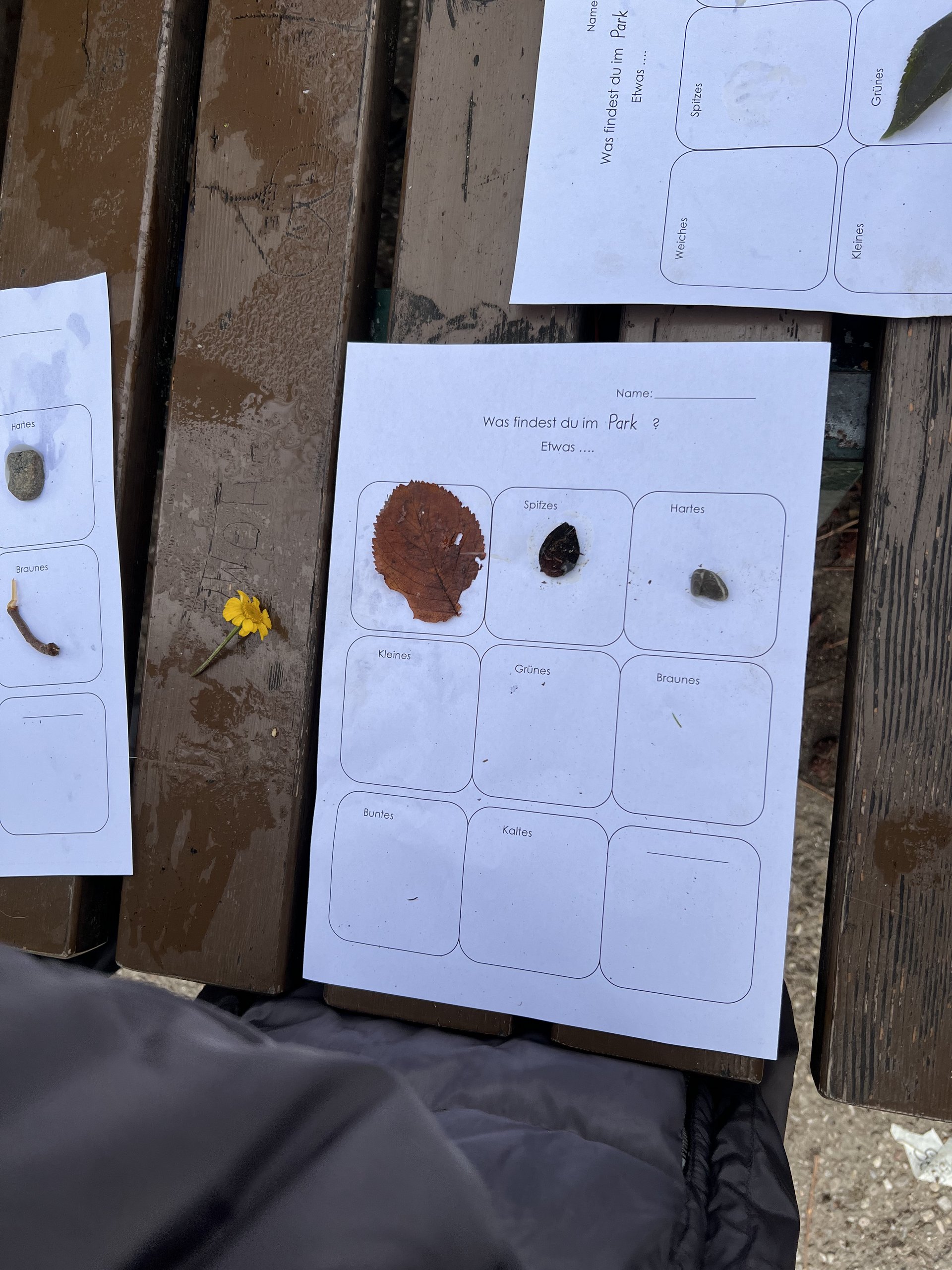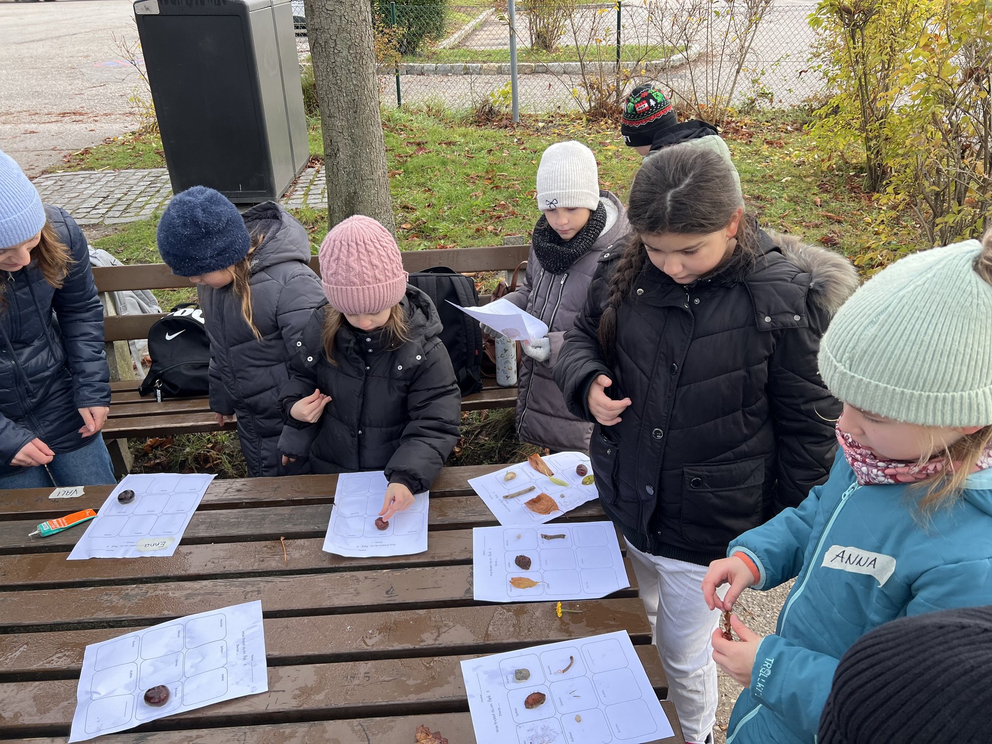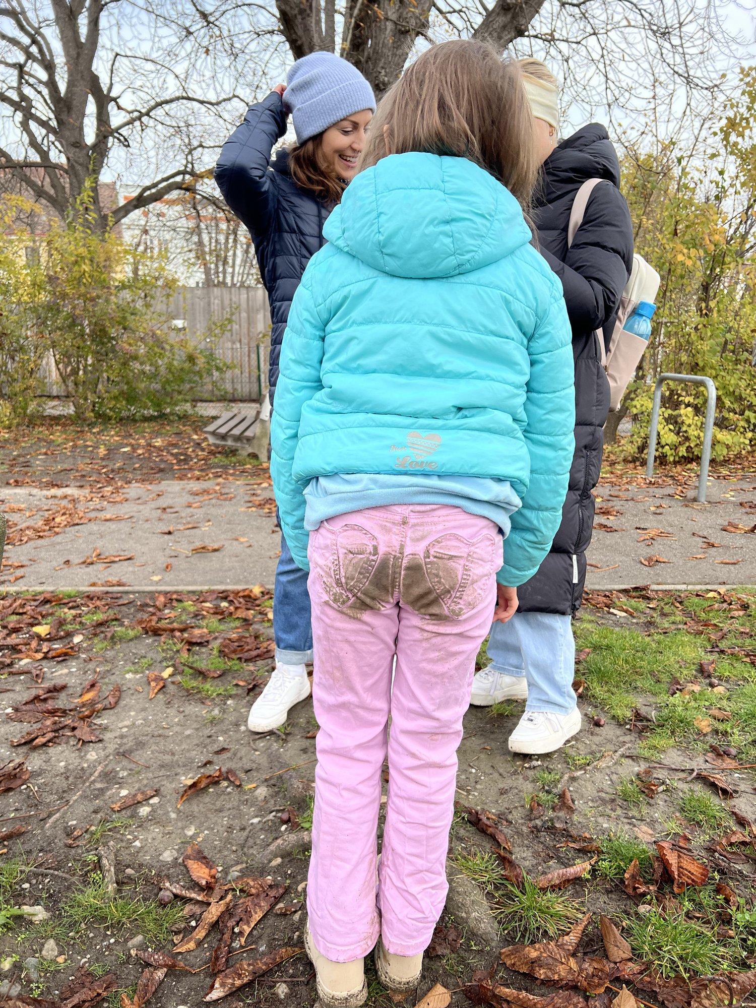Am Spielplatz angekommen, durften die Kinder zunächst nach Herzenslust frei spielen. Klettergerüste, Rutschen und Sandkasten wurden mit Lachen und fröhlichem Toben erobert. Danach wartete eine kleine kreative Aufgabe auf alle: Ein Arbeitsblatt sollte gestaltet werden, auf dem Dinge gesucht und gefunden werden mussten, die bunt, klein, weich und vieles mehr waren. Die Kinder waren eifrig dabei, entdeckten mit staunenden Augen die kleinen Schätze der Natur und setzten sie liebevoll auf ihrem Blatt in Szene.