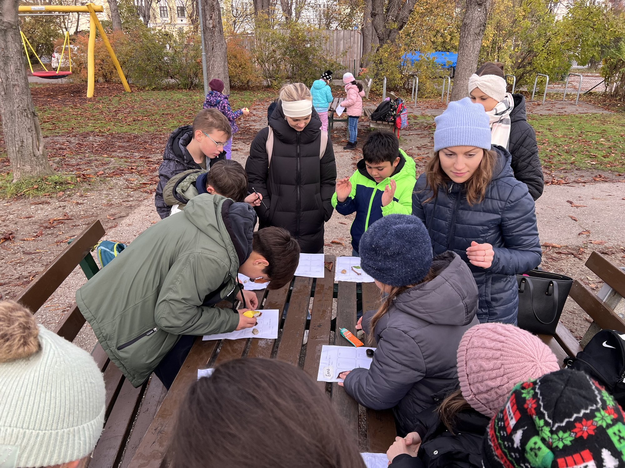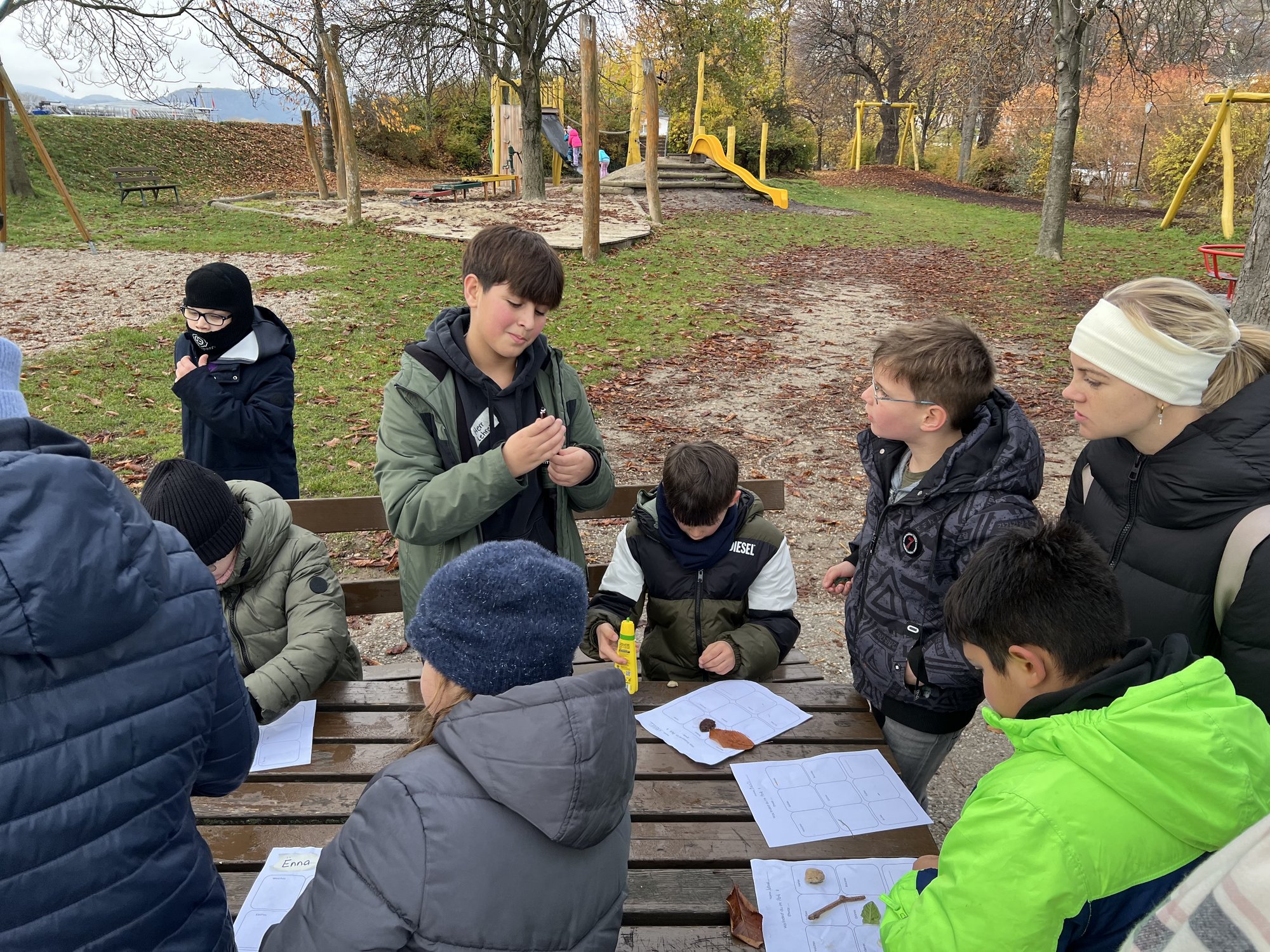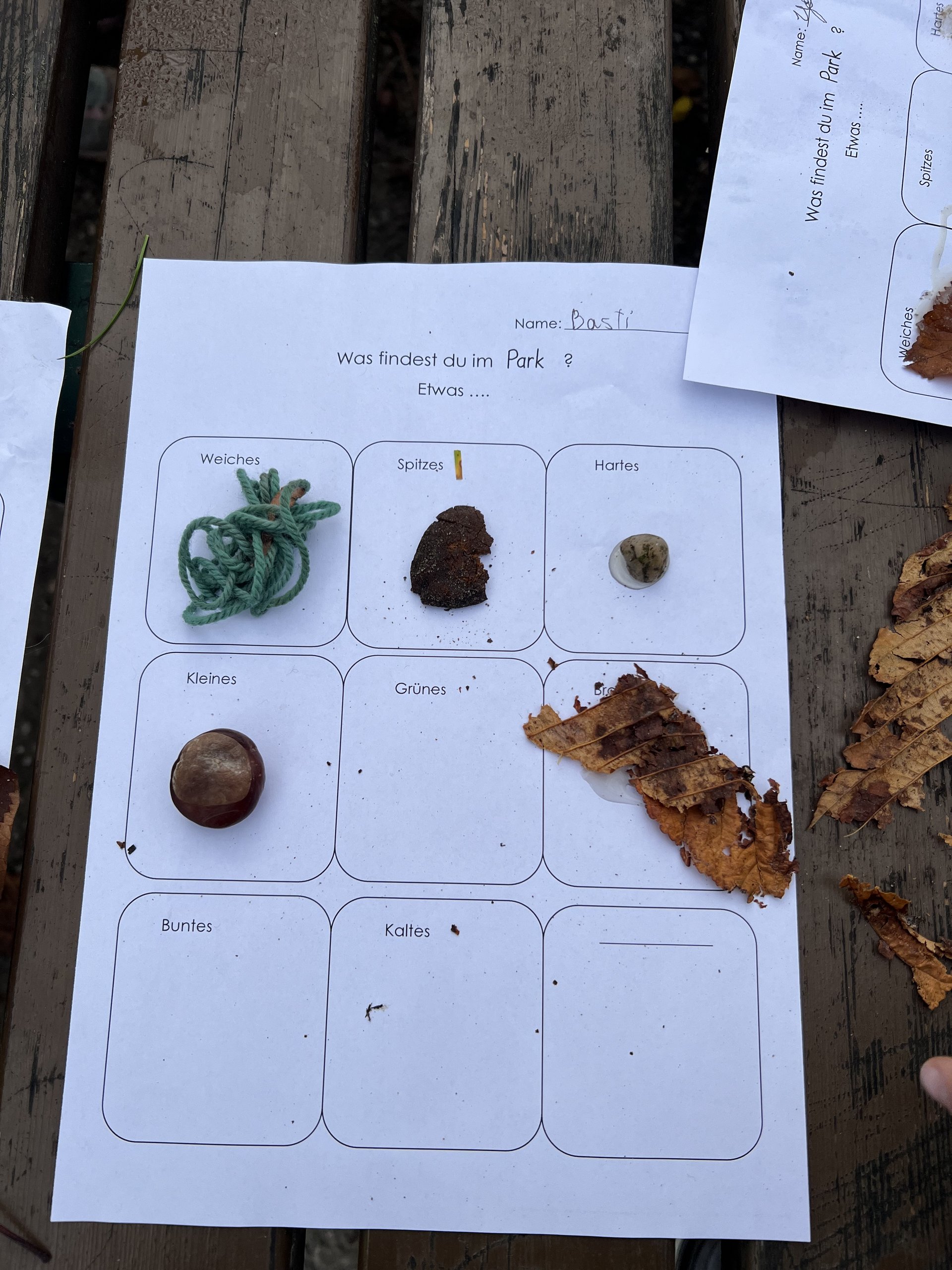 Am Spielplatz angekommen, durften die Kinder zunächst nach Herzenslust frei spielen. Klettergerüste, Rutschen und Sandkasten wurden mit Lachen und fröhlichem Toben erobert. Danach wartete eine kleine kreative Aufgabe auf alle: Ein Arbeitsblatt sollte gestaltet werden, auf dem Dinge gesucht und gefunden werden mussten, die bunt, klein, weich und vieles mehr waren. Die Kinder waren eifrig dabei, entdeckten mit staunenden Augen die kleinen Schätze der Natur und setzten sie liebevoll auf ihrem Blatt in Szene.