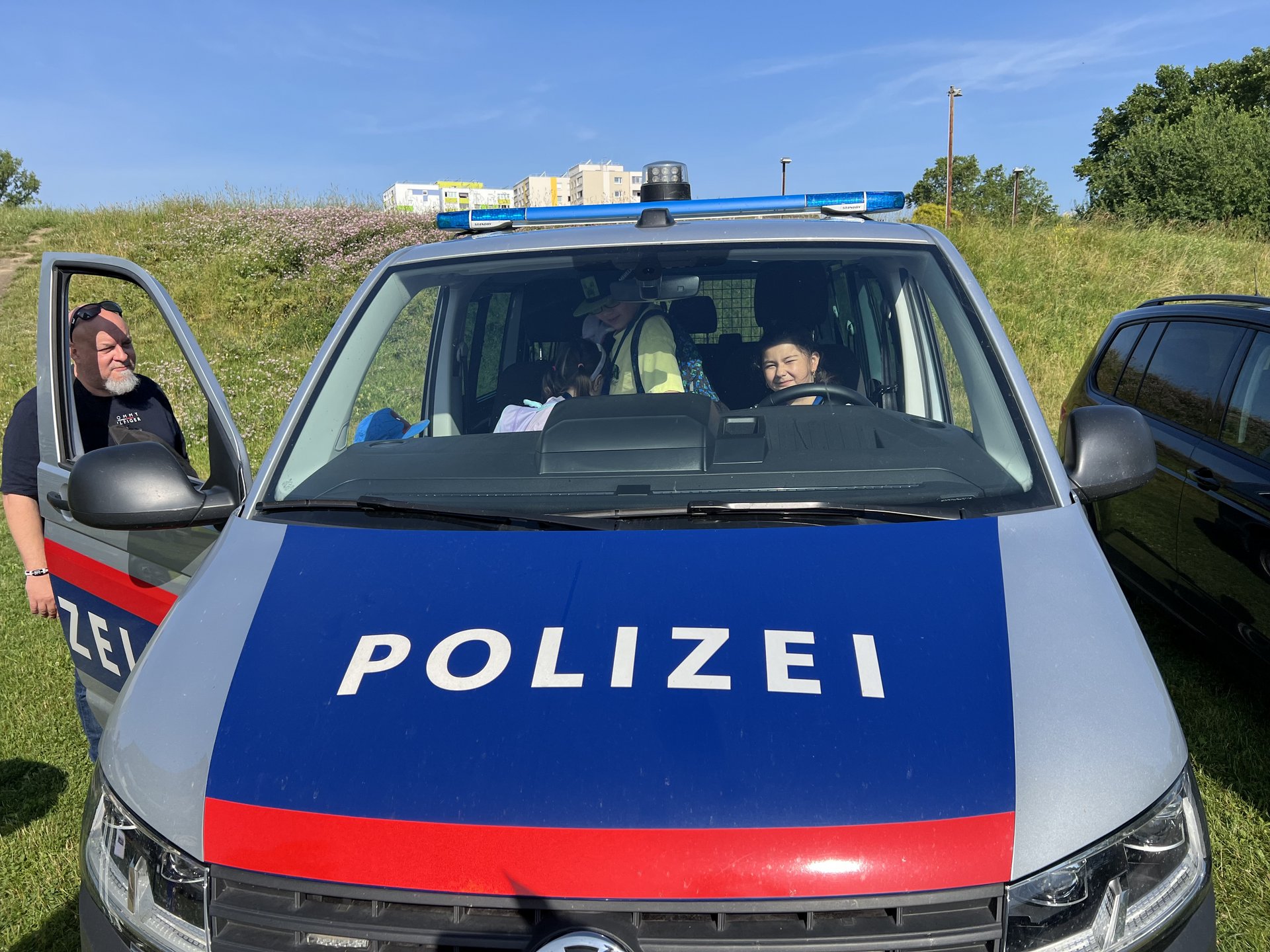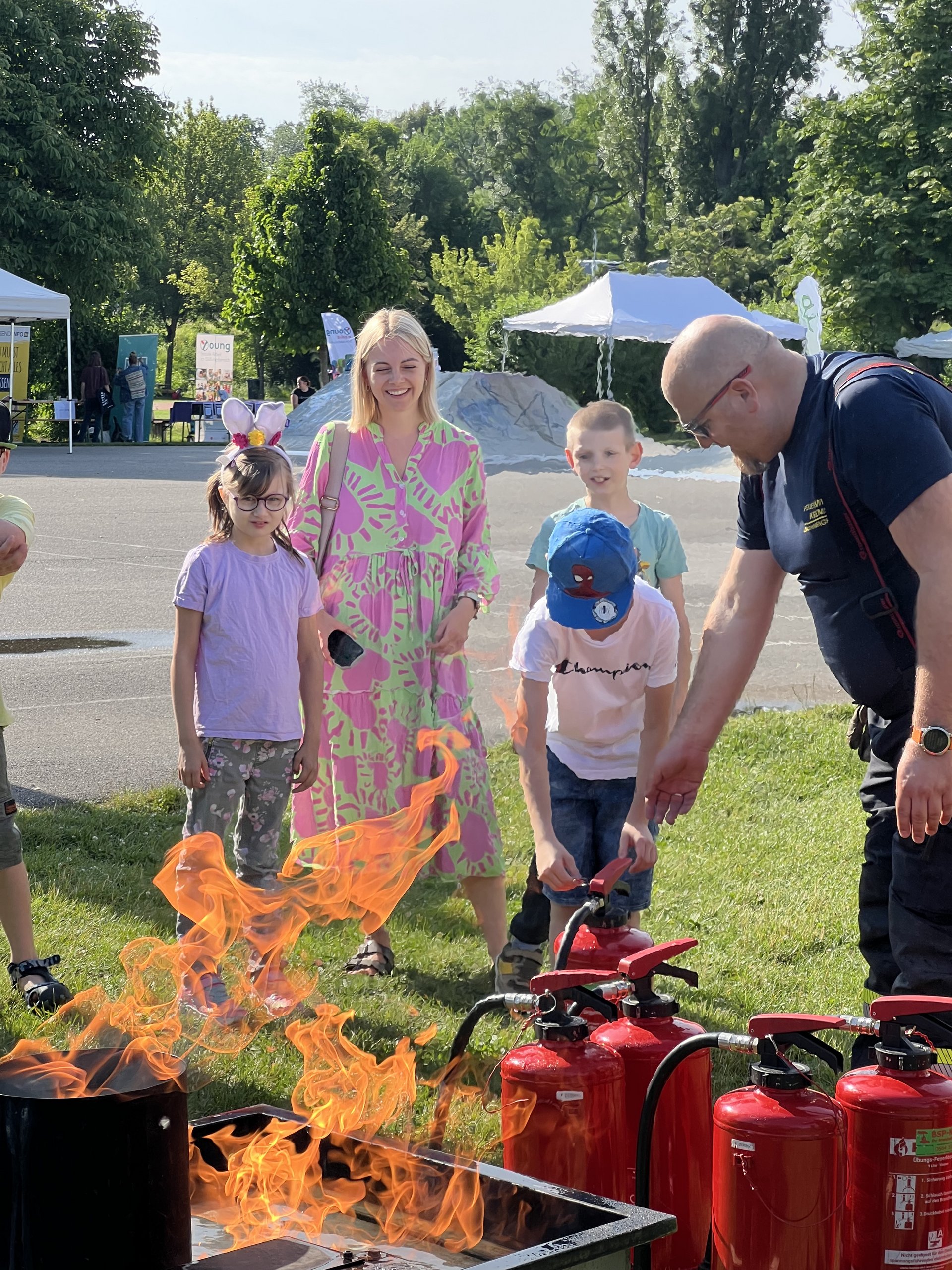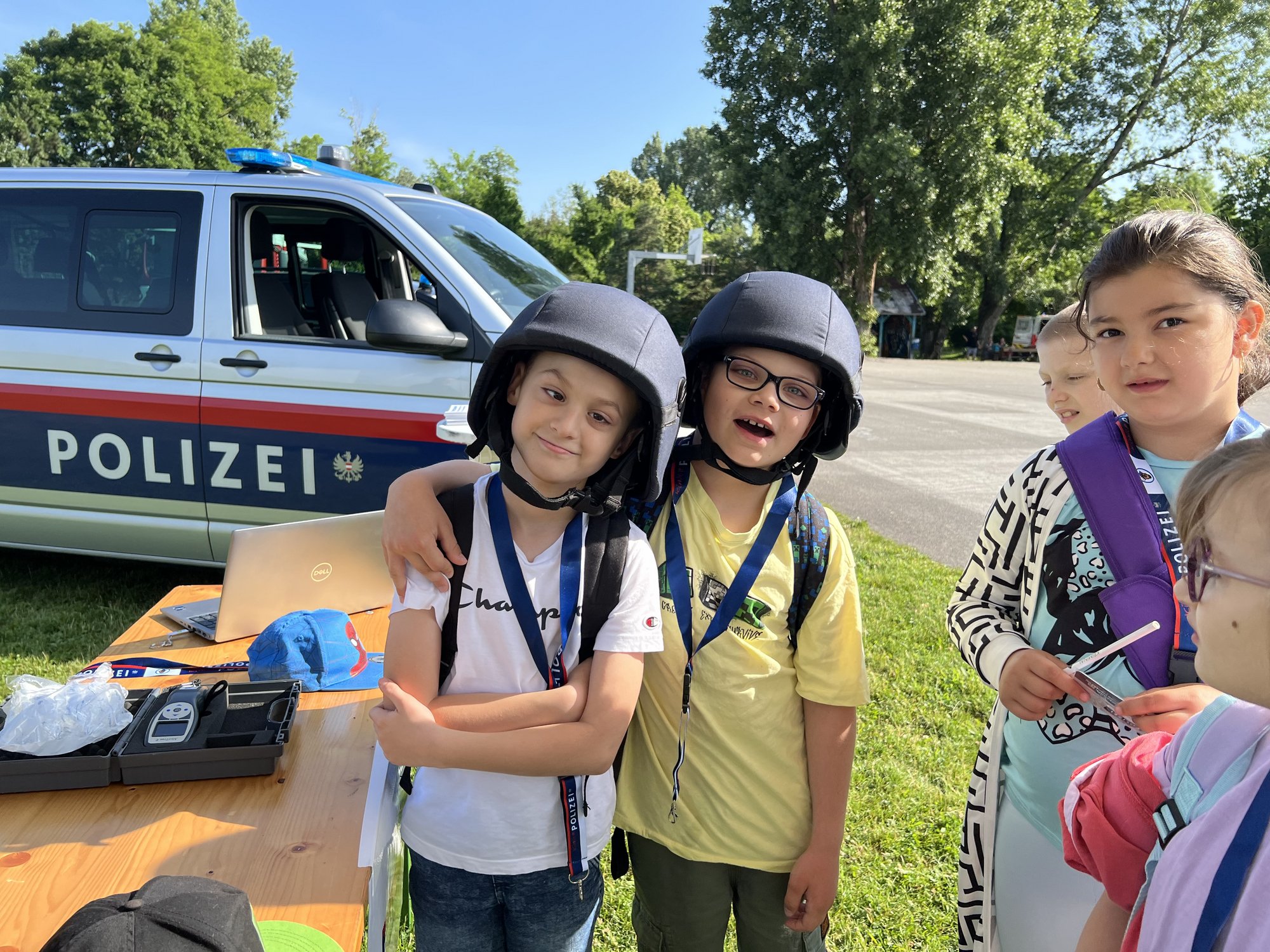 Die Feuerwehr hat uns am Anfang gleich in ihren Bann gezogen, schließlich war es nicht nur für die Schüler:innen sondern auch für uns Lehrer:innen das erste Mal, dass wir einen Feuerlöscher betätigen konnten. Eigentlich zum Glück, aber im Ernstfall zu wissen, wie dieses Gerät funktioniert, ist bestimmt nicht verkehrt. Nachdem wir das Feuer gelöscht hatten, ging es auch schon weiter zur Polizeistation. Dort angekommen, fragten wir natürlich alles, was wir schon immer wissen wollten.