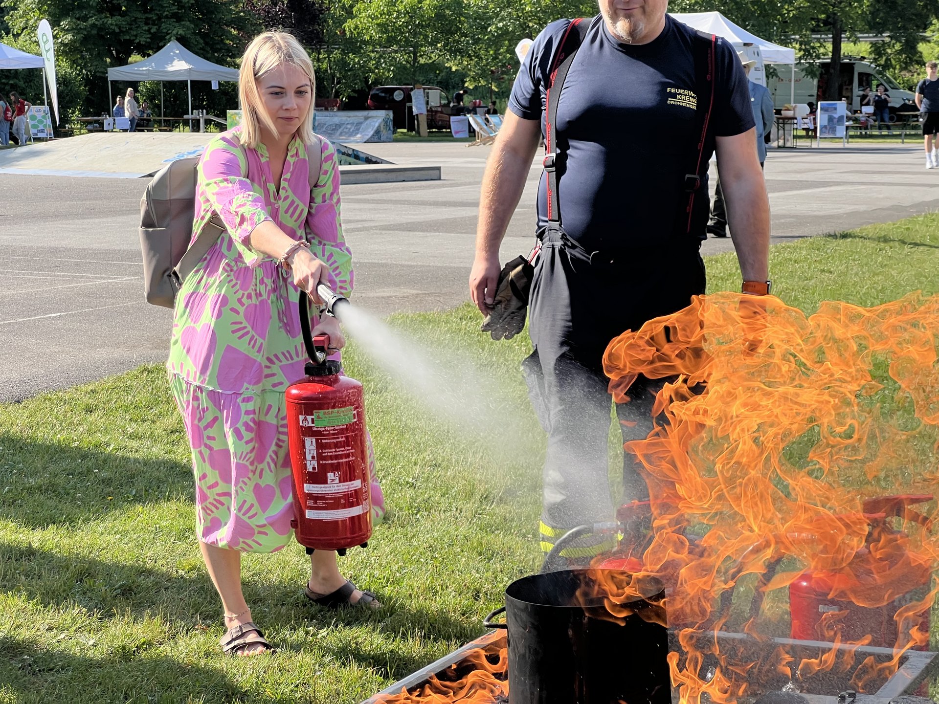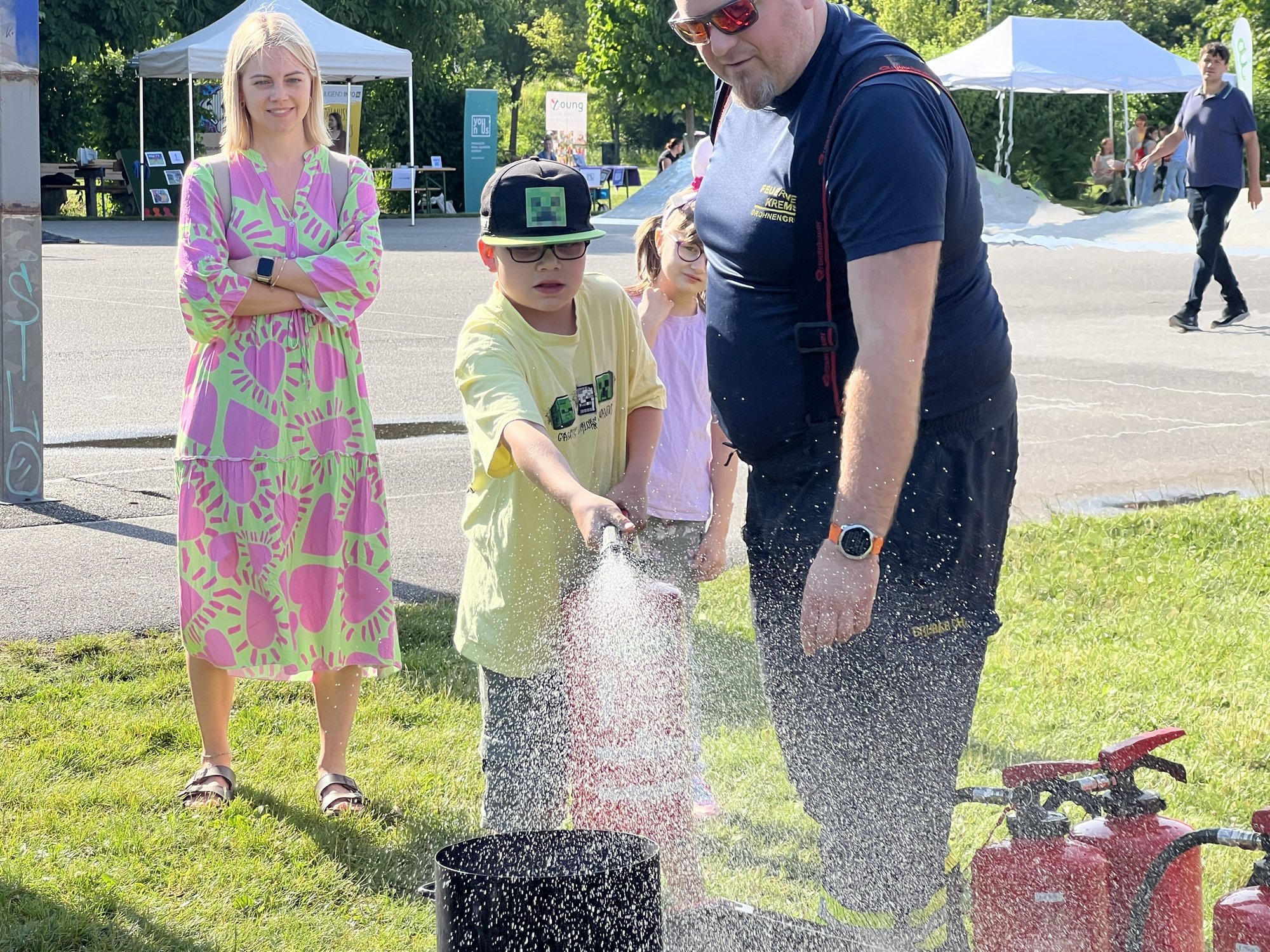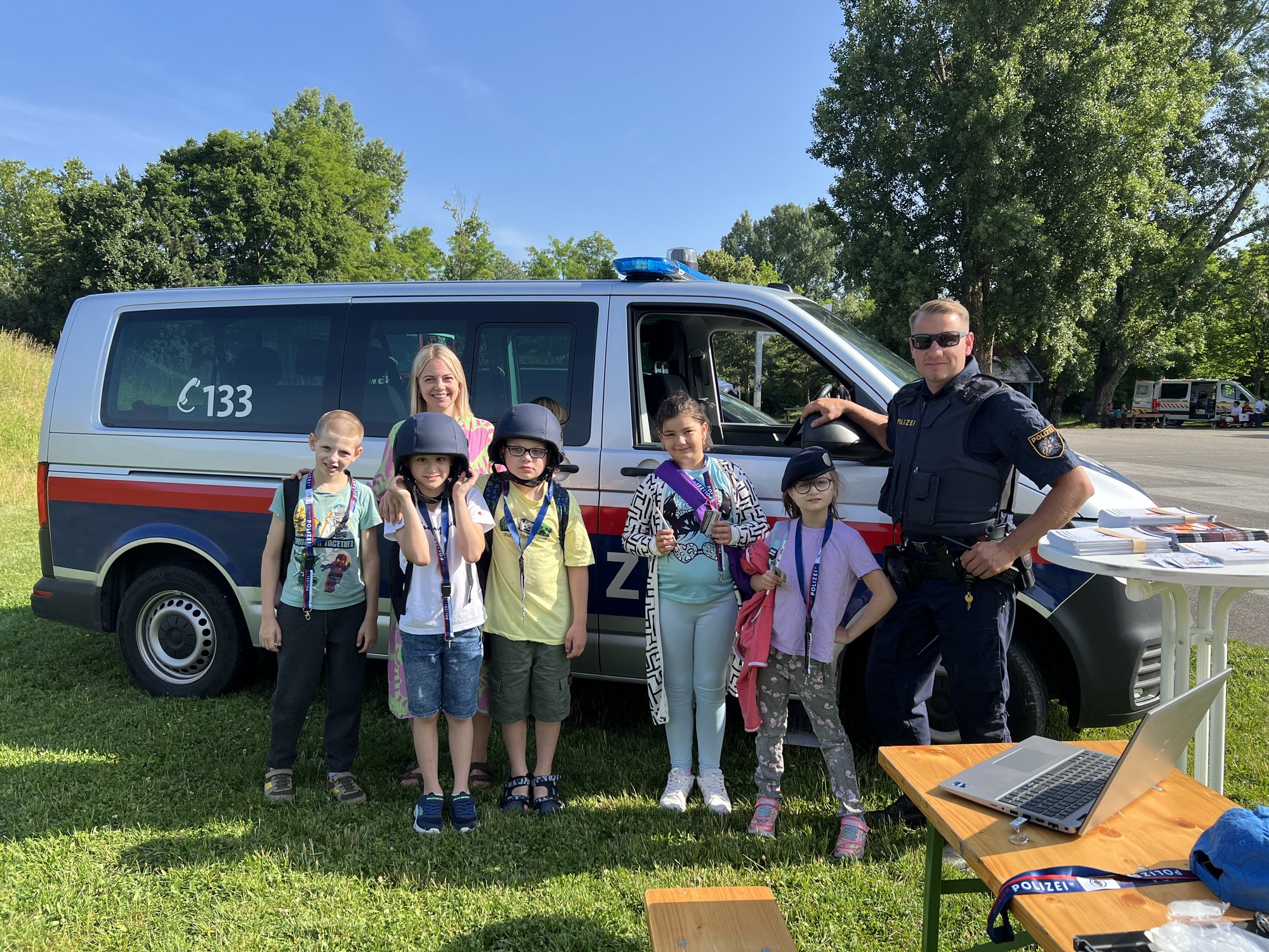 Die Feuerwehr hat uns am Anfang gleich in ihren Bann gezogen, schließlich war es nicht nur für die Schüler:innen sondern auch für uns Lehrer:innen das erste Mal, dass wir einen Feuerlöscher betätigen konnten. Eigentlich zum Glück, aber im Ernstfall zu wissen, wie dieses Gerät funktioniert, ist bestimmt nicht verkehrt. Nachdem wir das Feuer gelöscht hatten, ging es auch schon weiter zur Polizeistation. Dort angekommen, fragten wir natürlich alles, was wir schon immer wissen wollten.