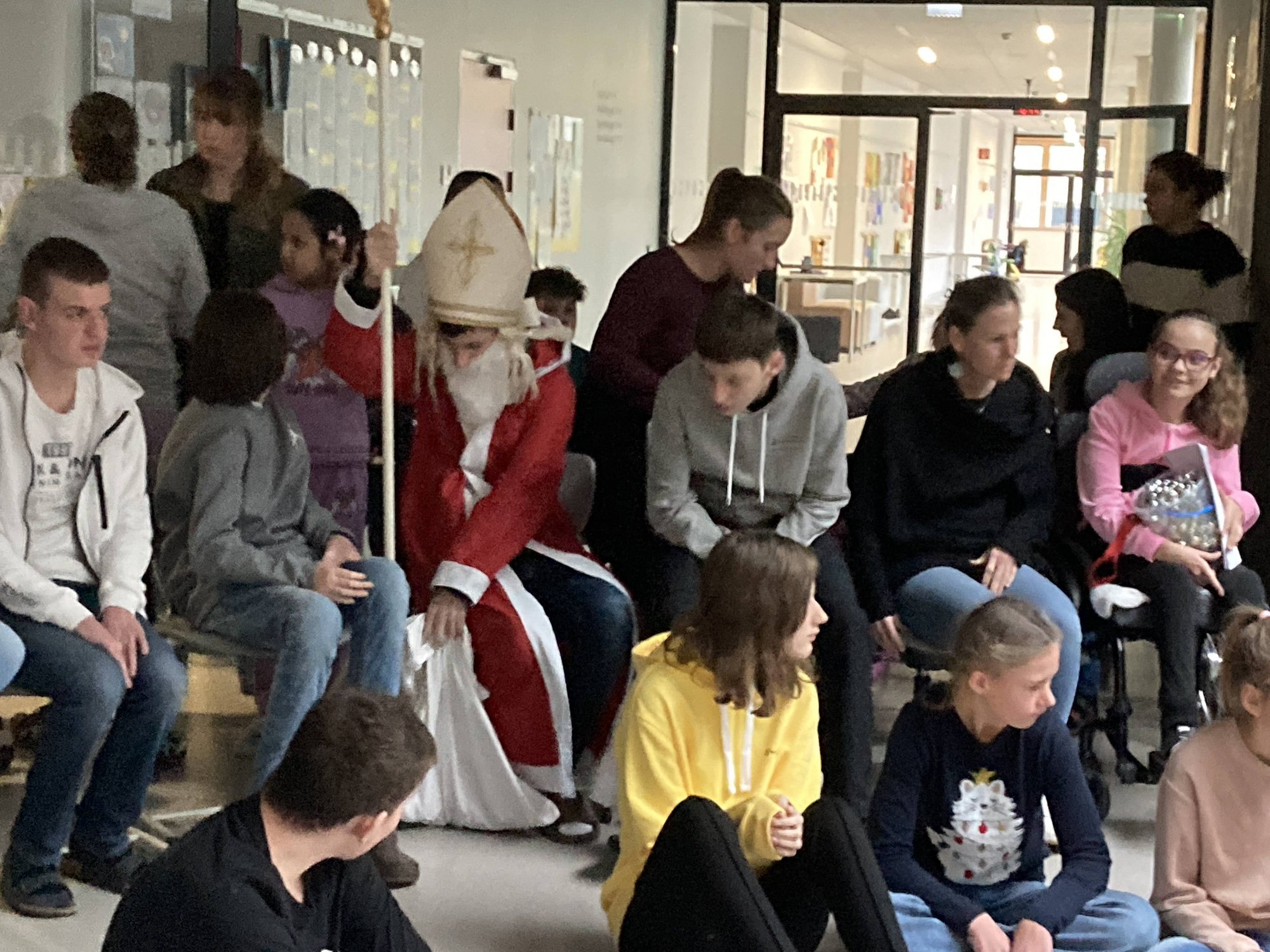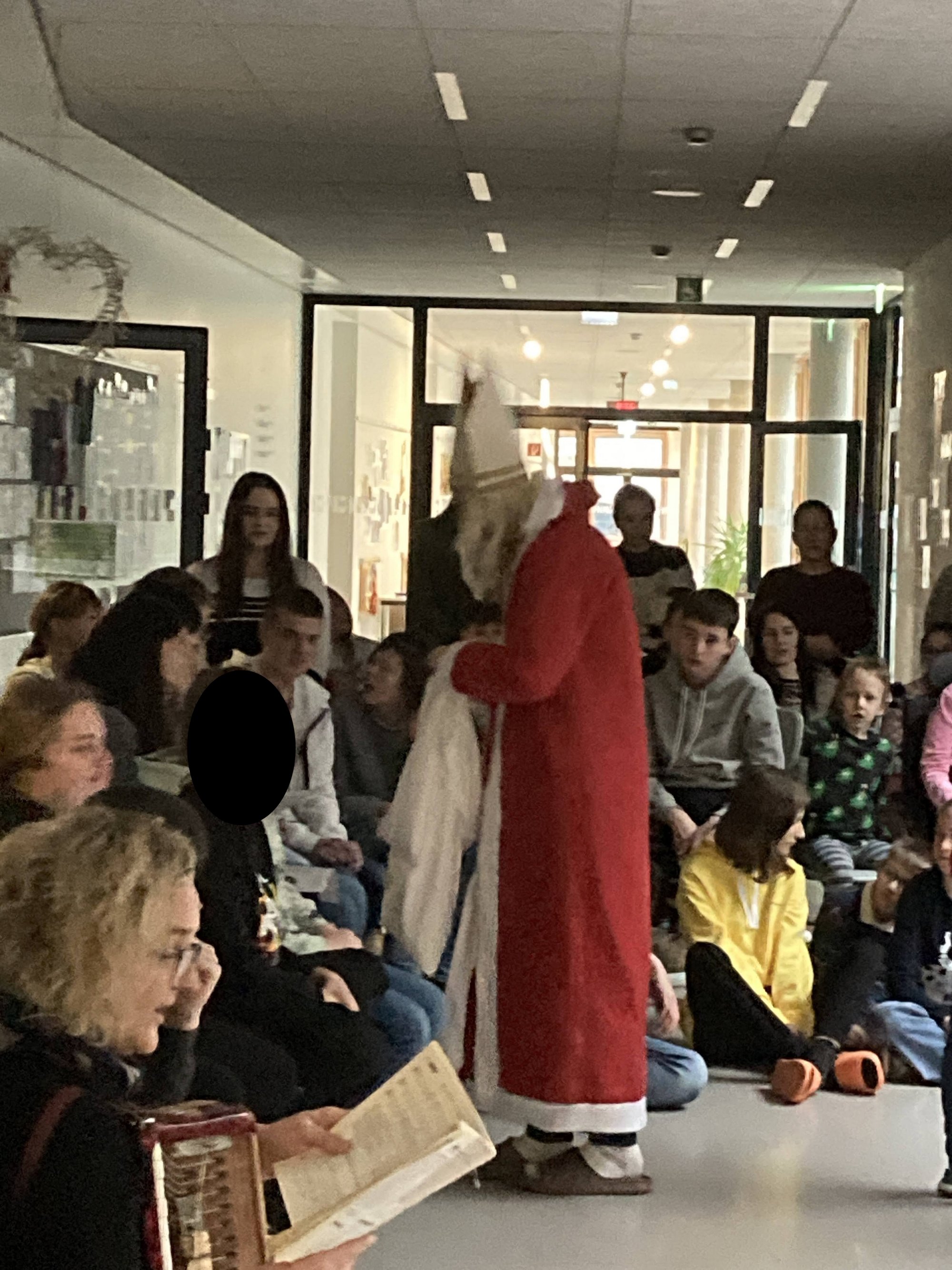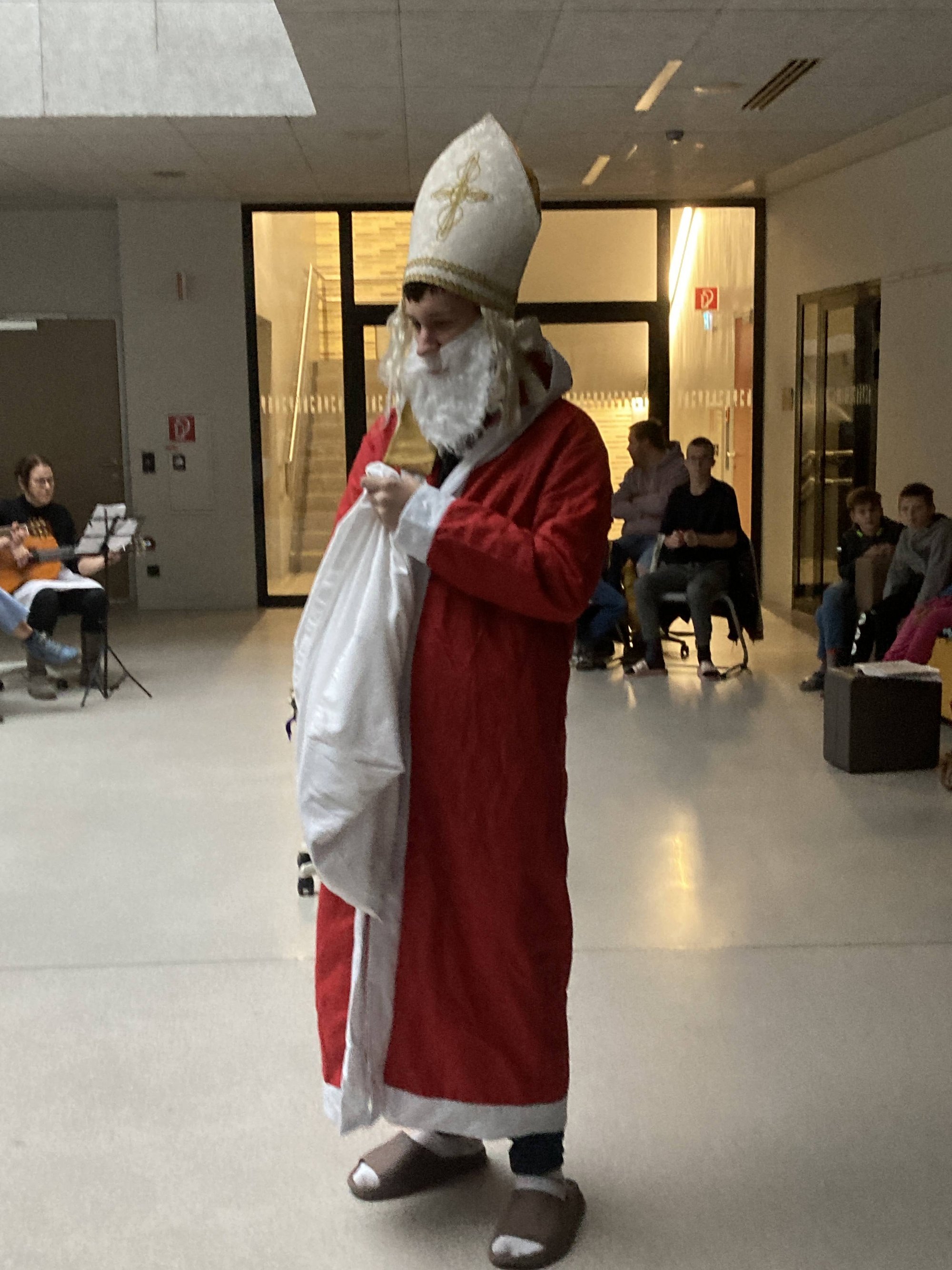 Unser Anes aus der KIZ2 verkleidet sich leidenschaftlich gern als Nikolaus. Deshalb war er bei der gemeinsamen weihnachtlichen Feier als Nikolaus im Einsatz. Es war ihm sehr wichtig zu erfahren, ob alle artig waren und danach gab es Süßigkeiten sowohl für unsere Schüler:innen als auch für unsere Lehrer:innen.