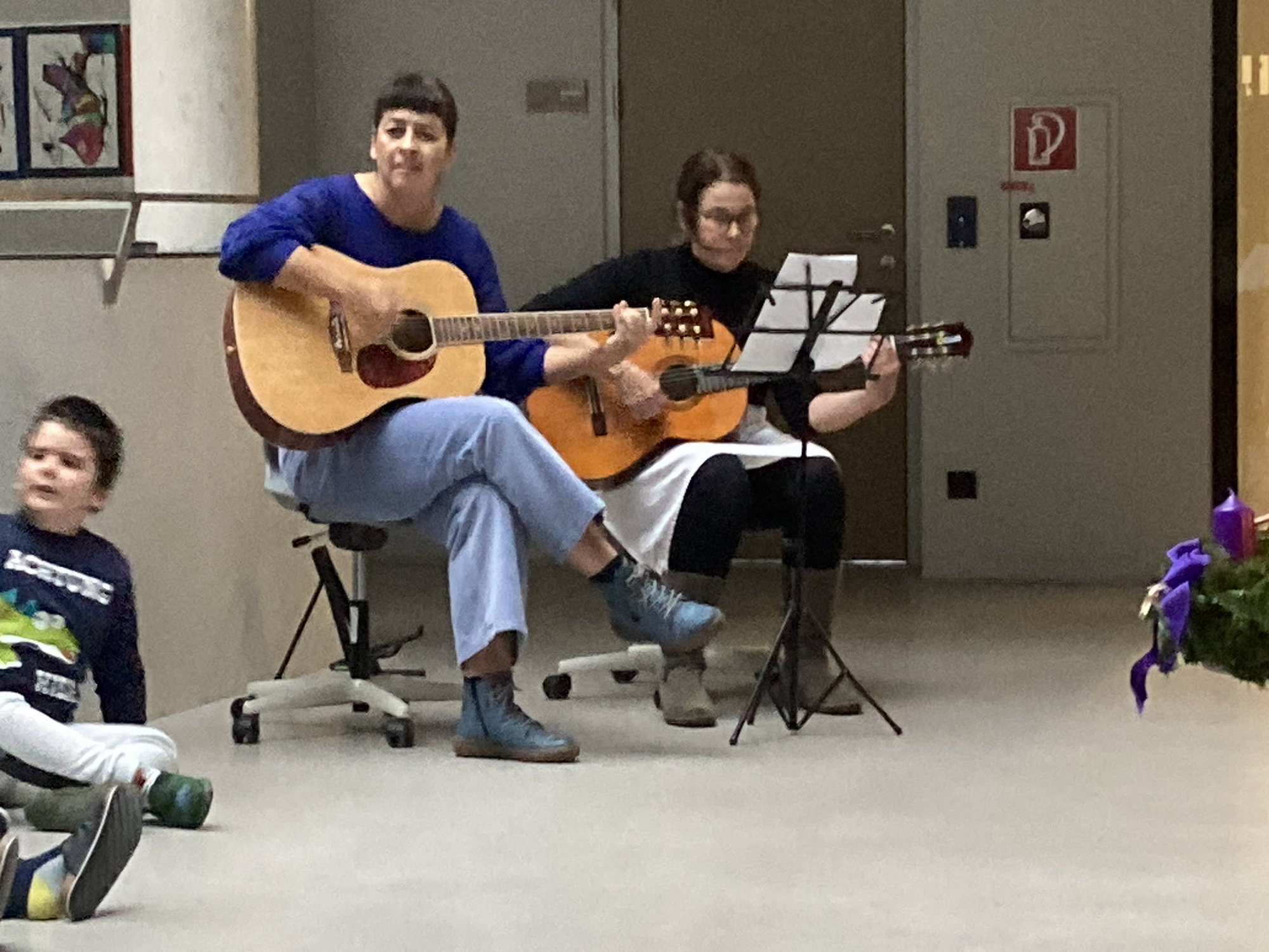 Frau Lehrerin Zanon und Frau Lehrerin Fuchshofer haben die Weihnachtslieder auf der Gitarre begleitet, Frau Lehrerin Decker hat auf der Okarina gespielt und alle anderen haben mitgesungen. Die Feier war sehr stimmungsvoll und bewegend zugleich.